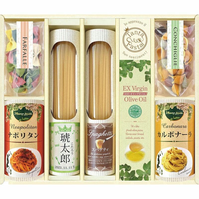 スパゲティ(200g)×2、自然色パスタ(ファルファーレ40g)×1、自然色パスタ(コンキリエ60g)×1、パスタソース(ナポリタン・カルボナーラ)140g×各1、エクストラバージンオリーブオイル8g×5