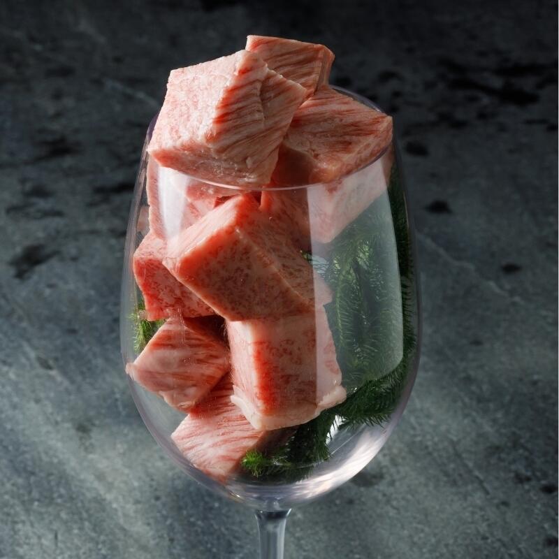 ヒウチとマルシンの希少部位を使用したサイコロステーキは、ジューシーで肉の旨味が凝縮されています。