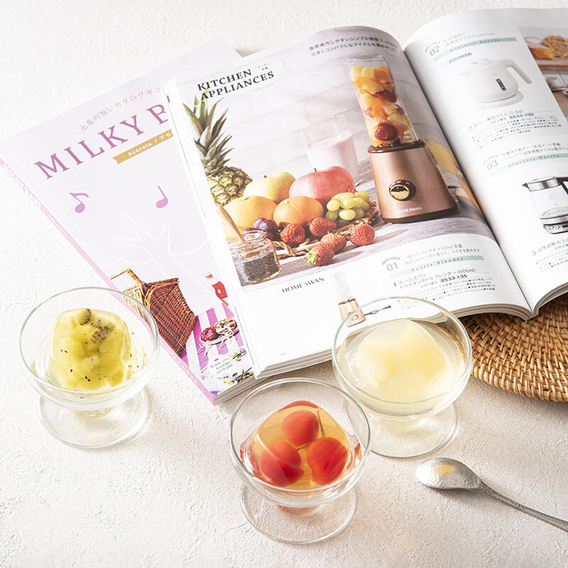 出産内祝い専用カタログギフト『MILKY BABY(ミルキーベビー)』に、銀座千疋屋の華やかなフルーツゼリーを合わせた特別セットです。