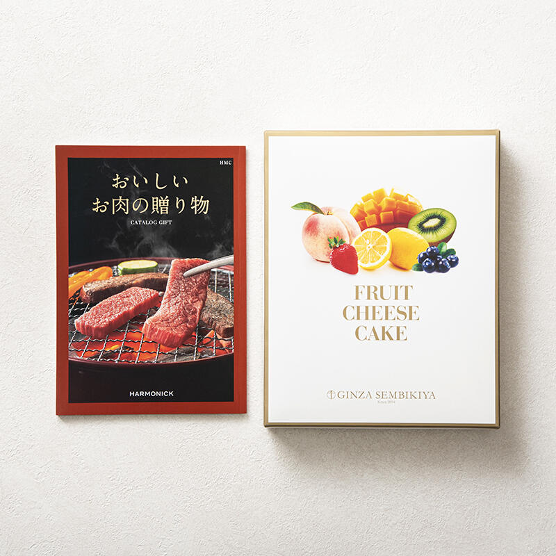 全国各地から厳選されたお肉のそろうカタログギフト『おいしいお肉の贈り物』と、老舗フルーツ専門店銀座千疋屋のフルーツチーズケーキ。贈り物として人気の高い一冊に、見た目にも美しいスイーツを添えて華やかなセットに仕立てました。心に残る特別なおいしさは、大切な方へ感謝を伝えたいシーンに最適です。目上の方への贈り物にもぜひどうぞ。