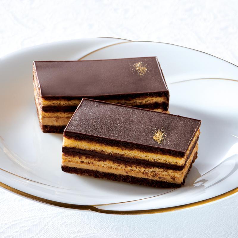 チョコレートグラサージュ、コーヒー生地、チョコレートクリーム、コーヒークリーム、チョコレート生地により6層に仕上げた新レシピのオペラです。