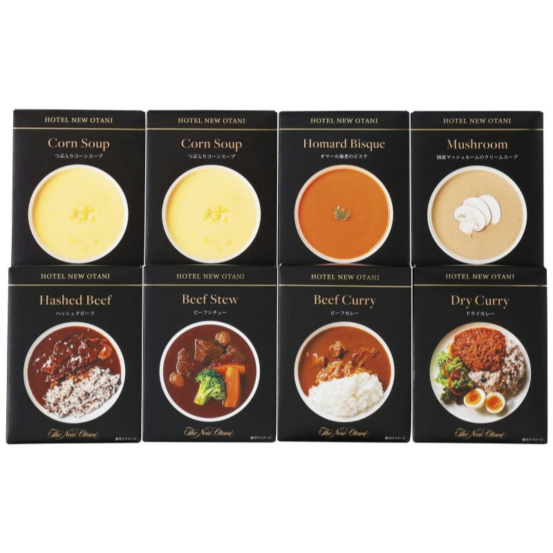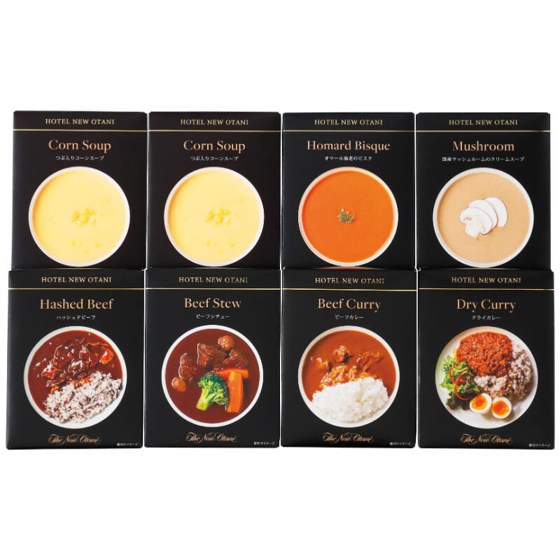 【商品内容】(つぶ入りコーンスープ×2・国産マッシュルームのクリームスープ・オマール海老のビスク・ドライカレー)各150g、(ビーフカレー・ハッシュドビーフ・ビーフシチュー)各180g