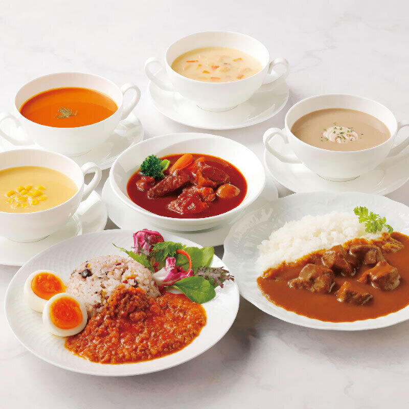 【商品内容】(つぶ入りコーンスープ・野菜のチャウダー・10種野菜のクリームスープ・パンプキンクリームスープ・オニオンスープ・オマール海老のビスク・国産マッシュルームのクリームスープ・コンソメスープ・ドライカレー)各150g、(ビーフカレー・ハッシュドビーフ・ビーフシチュー)各180g