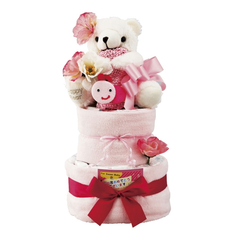 【商品内容】おむつケーキ約410×230×230mm(パンパース紙おむつSサイズ×30)、くまのぬいぐるみ180×180×150mm、タオル340×760mm×2、帽子、造花