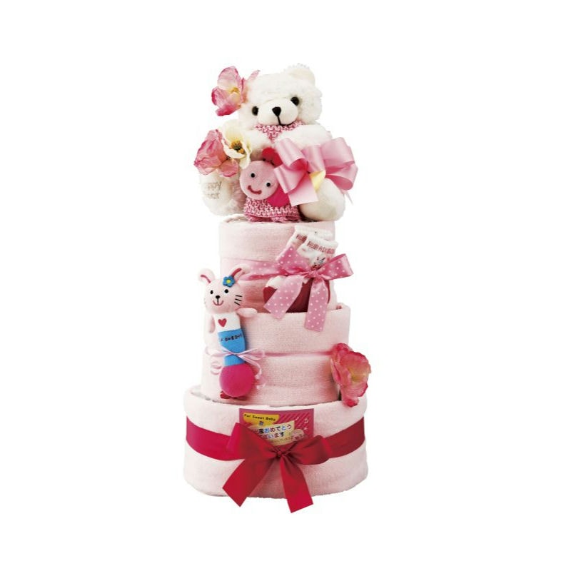 【商品内容】おむつケーキ約520×250×250mm(パンパース紙おむつSサイズ×50)、くまのぬいぐるみ180×180×150mm、ソックス、ニギニギ、帽子、タオル340×760mm×3