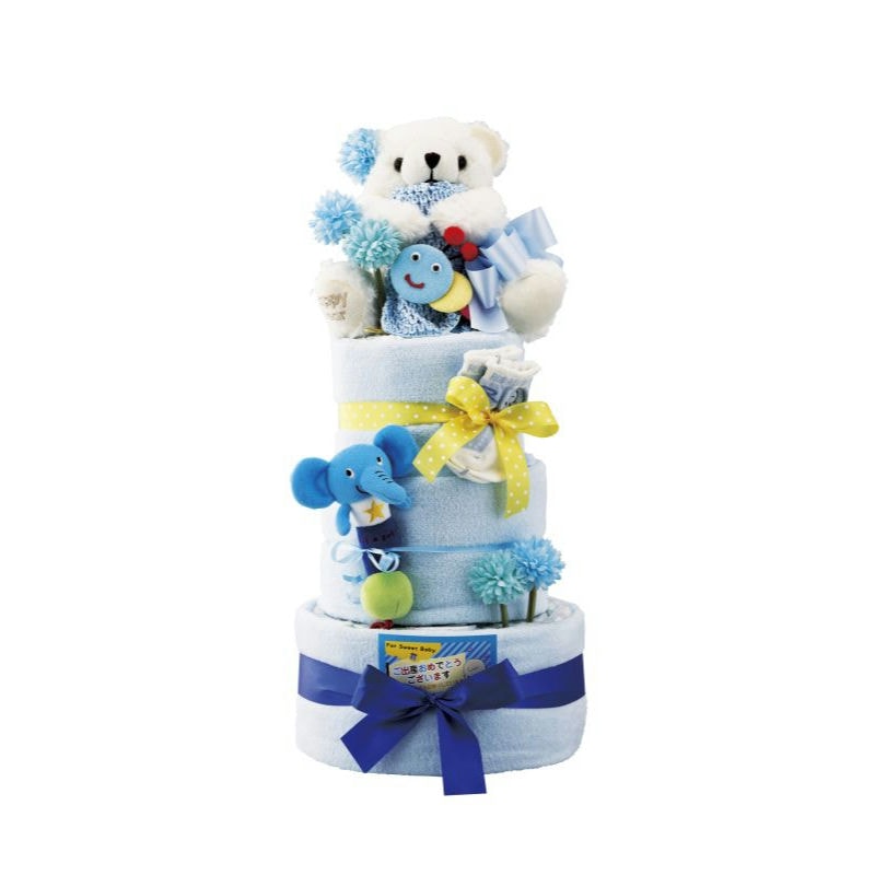 【商品内容】おむつケーキ約520×250×250mm(パンパース紙おむつSサイズ×50)、くまのぬいぐるみ180×180×150mm、ソックス、ニギニギ、帽子、タオル340×760mm×3