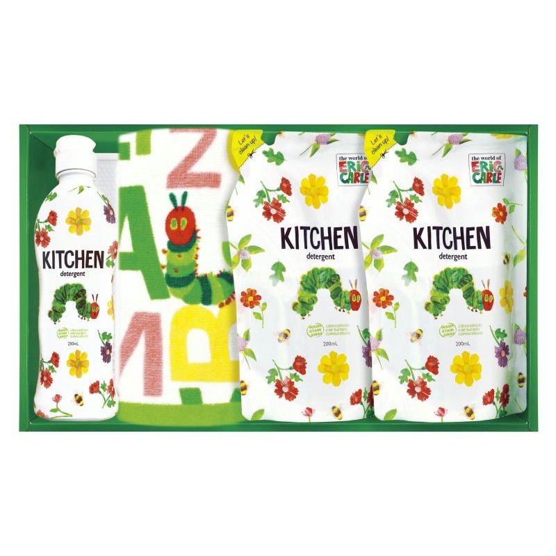 清潔感溢れるデザインが心地よい「はらぺこあおむし」のキッチン洗剤セット。