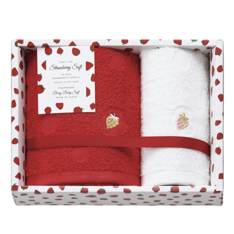 ホワイトとレッドのカラーに苺のワンポイントの刺繍がかわいいタオルギフトです。