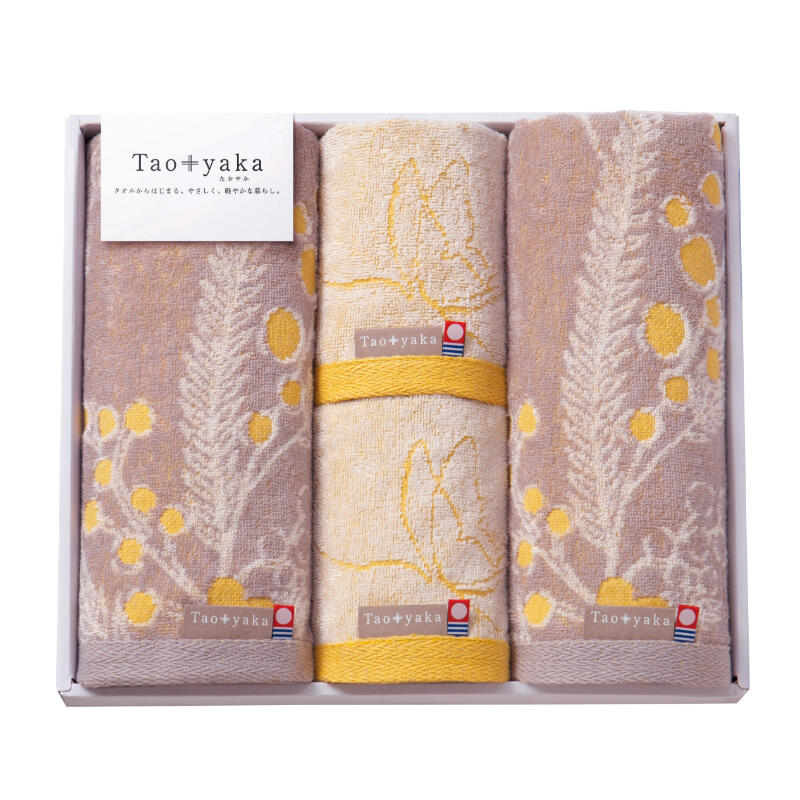 ミモザのふわふわやわらかな黄色の花がかわいらしいタオル「感謝」「友情」「密かな愛」そんな素敵な花言葉を持ったミモザはふわふわとしたたくさんの黄色い花が特徴です。ミモザの花をふんだんにあしらったタオルはタオルの産地、今治で織られ吸水性も抜群。やわらかでナチュラルな黄色と落ちついたグレーベージュのデザインはどんな部屋にも馴染み、インテリアにもぴったりです。