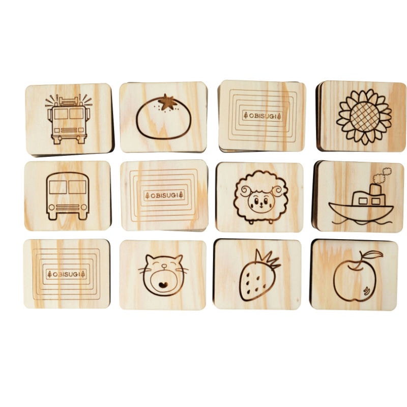カードタイプの杉パネルを順番にめくりながら、同じ絵柄を探す神経衰弱ゲーム。ドミノ倒しや積み木としても遊べます。