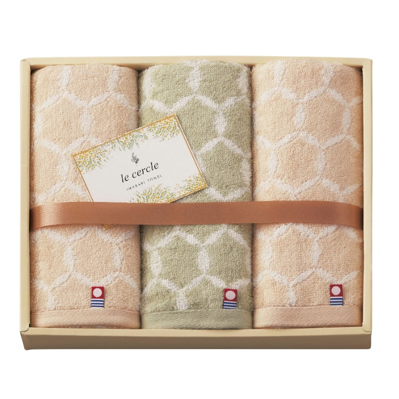シリーズ名「ル・セルクル」の“セルクル”は、フランス語で「円(サークル)」を意味します。「円(えん)」をくり返したデザインのタオルに人とのつながり、「縁(えん)」が末永く続きますように…という想いを込めました。