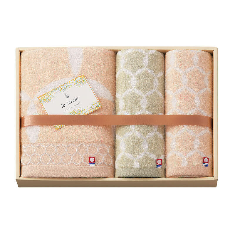 シリーズ名「ル・セルクル」の“セルクル”は、フランス語で「円(サークル)」を意味します。「円(えん)」をくり返したデザインのタオルに人とのつながり、「縁(えん)」が末永く続きますように…という想いを込めました。