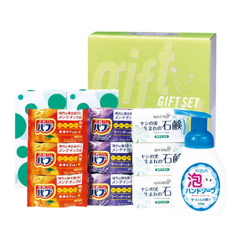 【商品内容】アクア泡ハンドソープ250ml・animoヤシの実石鹸(80g×3P)・バブ(ゆずの香り・ラベンダーの香り)各3