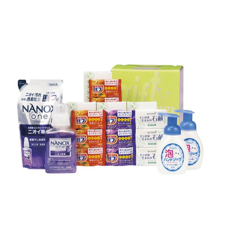 【商品内容】NANOX one ニオイ専用(本体380g・詰替320g)・アクア泡ハンドソープ250ml×2・animoヤシの実石鹸3P・バブ(ゆずの香り×6・ラベンダーの香り×3)