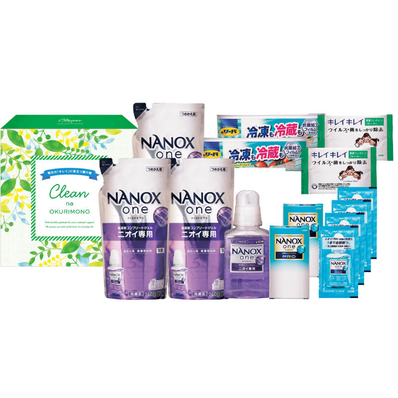 【商品内容】NANOX one PRO(10g×2袋)×2・NANOX one ニオイ専用(本体380g・詰替280g×3)・キレイキレイ除菌ウェットシート(アルコールタイプ)1枚×2・リード 冷凍も冷蔵も新鮮保存バッグ S1枚×2