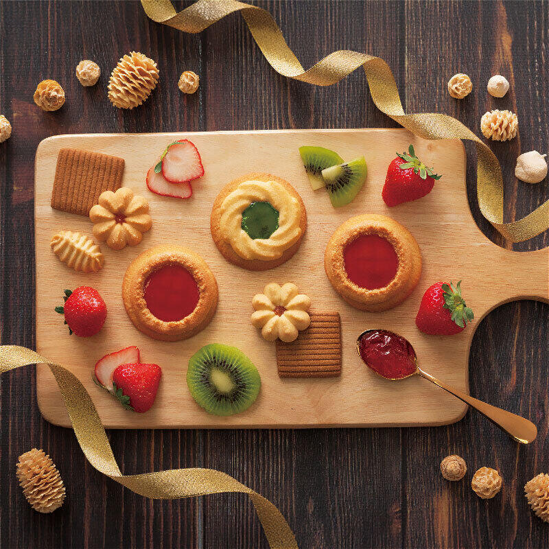 二度焼した2種類のクッキー生地に、フルーツジャムでデコレーションした素朴で懐かしい「ベイクドクッキー」やさっくりと焼き上げたサブレ生地に、ラム酒のシロップに漬け込んだ柔らかなレーズンとくちどけなめらかなホワイトクリームをサンドした「レーズンサンド」、素材の持ち味を生かして焼き上げた、上品な味わいのクッキーの詰合せ。