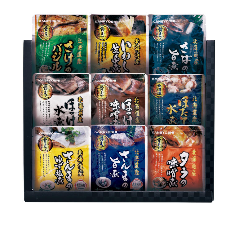 【商品内容】さけのバジル80g・いわしの生姜煮95g・さばの旨煮120g・ほっけの水煮80g・ほっけの味噌煮80g・ほたての水煮65g・さんまのゆず塩煮95g・さんまの旨煮95g・タラの味噌煮80g