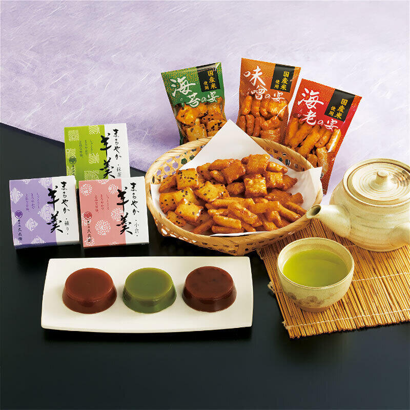 【商品内容】抹茶入り煎茶80g×2・あられ(海老・海苔・味噌)各12g・羊かん(抹茶・練り・小倉)60g×各2