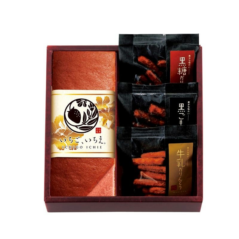 【商品内容】和三盆糖入かすてぃら(いちご)1本・かりんとう(黒糖・黒胡麻・牛乳)各15g