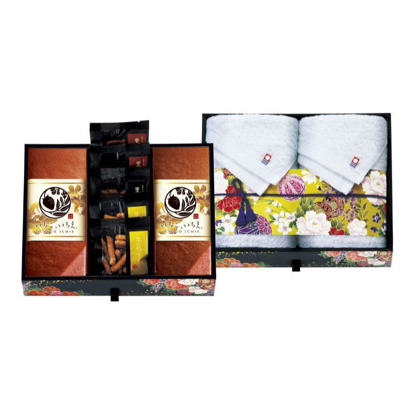 美しいミニたんすに、こだわりの国産原料を使用した”かすてぃら”、コクのあるかりんとう、今治タオルが入った豪華なギフトです。