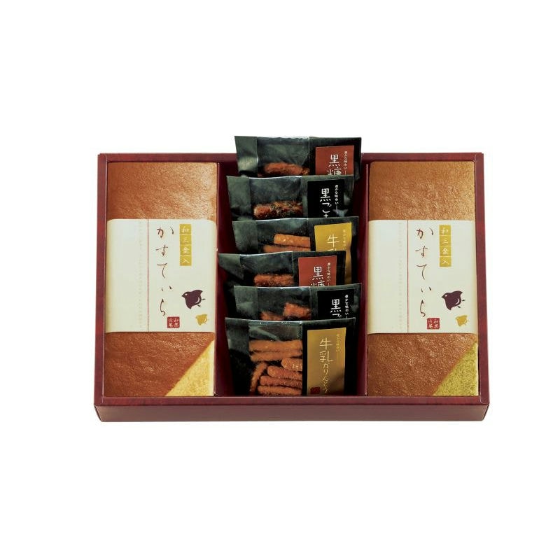 昔ながらの製法でしっとりと焼き上げた「かすてぃら ほまれ」とコクのあるかりんとうの詰め合わせギフトです。