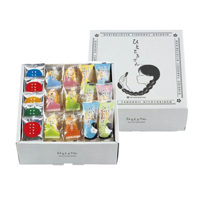 クラシック音楽を聴かせて仕込んだおかき「米と音のハーモニー」と、あっさり塩味とコクのあるカレー味のひねり揚げ「ひねりんぽん」、なつかしい味のミレーフライ「まんまるミレーヌ」の3種類のお菓子のアソートです。