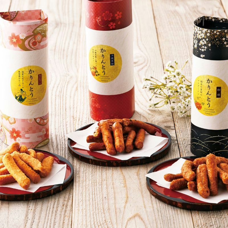 国産きなこをまぶし、甘さを抑え少し塩味に仕上げた懐かしい味のきなこかりんとうと、昔ながらの定番の味クセになる美味しさの風味豊かな黒かりんとう、珈琲の香ばしさが甘みを引き立ててくれる大人味の珈琲かりんとう、沖縄産黒糖を使用した黒糖の風味が広がる、ツヤが美しい沖縄黒糖かりんとうの詰合せです。