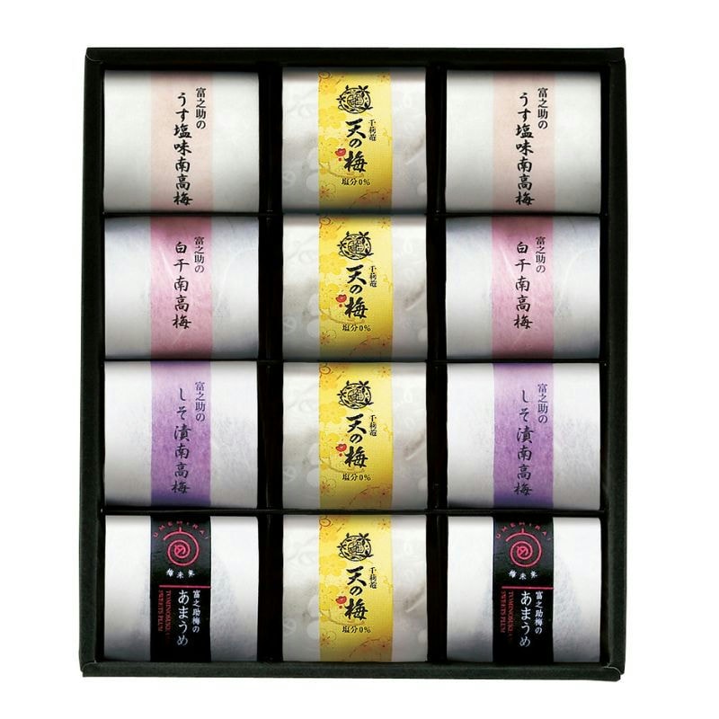 【商品内容】富之助のしそ漬南高梅(8g×2)・富之助の南高梅うす塩味(8g×2)・富之助の白干南高梅(8g×2)・富之助のあまうめ(8g×2)・千莉菴の天の梅(8g×4)