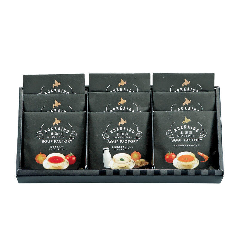【商品内容】北海道産 スープ(じゃがいものビシソワーズ×2・南蛮海老のビスク×1・生クリームのクラムチャウダー×2)、こだわりのスープ(完熟とまとのミネストローネ×2・海鮮の旨みブイヤベース×2)