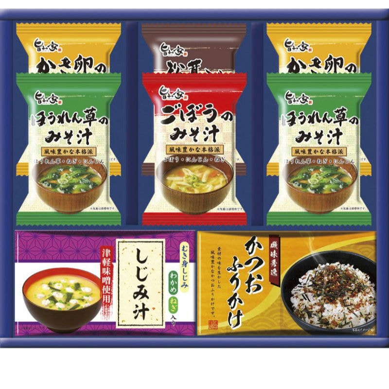 【商品内容】しじみ汁(4食入)・かつおふりかけ(3食入)・フリーズドライ(かき卵のみそ汁×2・ほうれん草のみそ汁×2・ごぼうのみそ汁・松茸入りお吸いもの)