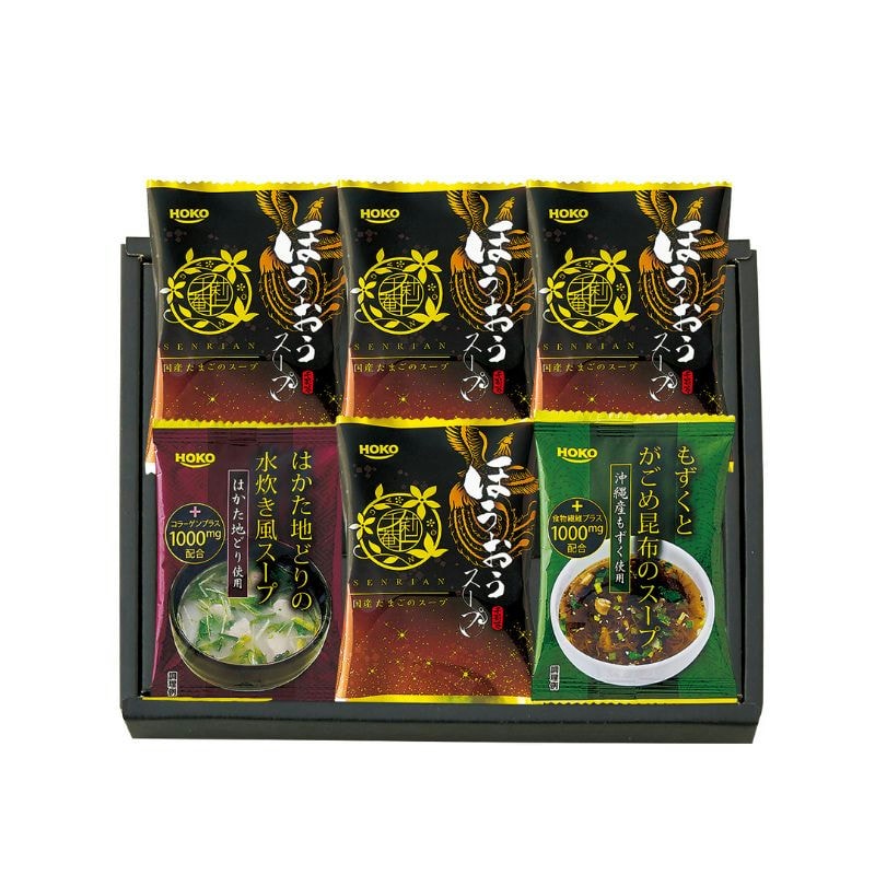 【商品内容】スープ(ほうおう)×4・スープ(はかた水炊き・もずく)各1