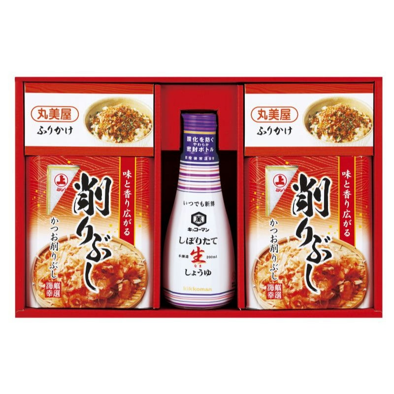 【商品内容】キッコーマンしぼりたて生しょうゆ200ml・丸美屋ふりかけ5種(さけ風味・しそ風味・かつお風味・たまご・たらこ風味)×2・かつお削り節(3g×4袋)×2