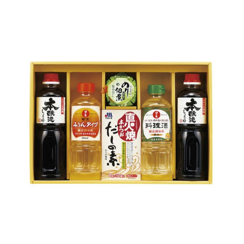 【商品内容】サンビシ本醸造しょうゆ500ml×2・日の出(割烹みりんタイプ・料理酒)各400ml・島乃香のり佃煮80g・マルトモ直火焼本かつおだしの素(4g×10袋入)