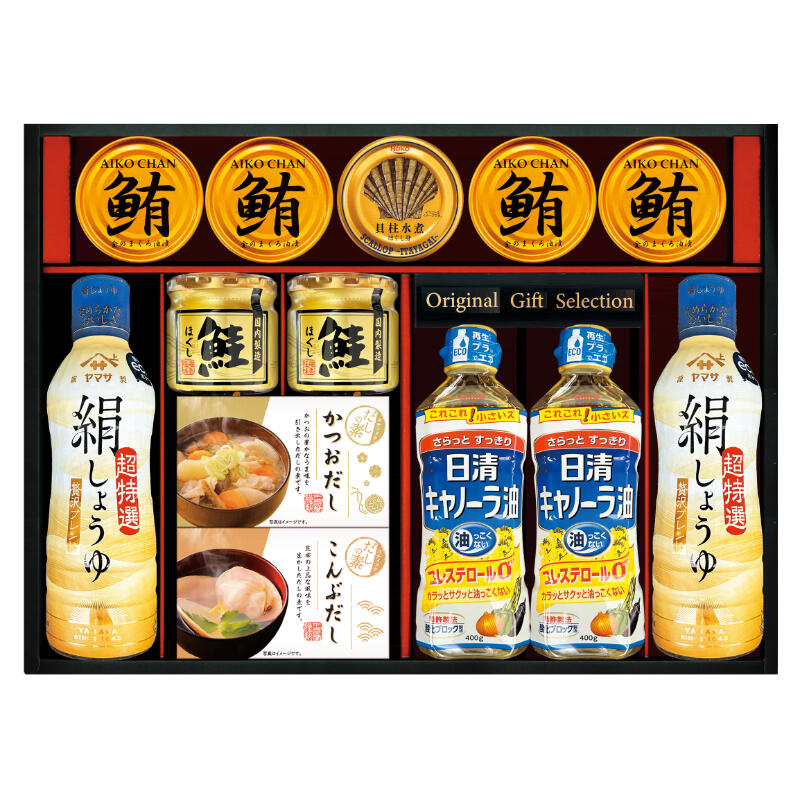 【商品内容】ヤマサ絹しょうゆ450ml×2・かね七かつおだし(4g×5)・かね七こんぶだし(4g×5)・まぐろ油漬け70g×4・鮭ほぐし50g×2・日清キャノーラ油400g×2・宝幸貝柱水煮ほぐし身65g