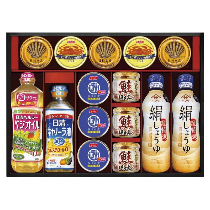 【商品内容】ヤマサ絹しょうゆ450ml×2・鮭ほぐし50g×3・日清キャノーラ油400g・日清ヘルシーベジオイル600g・宝幸貝柱水煮ほぐし身65g×3・ニッスイさば水煮150g×3・ニッスイ紅ずわいがにほぐし身55g×2