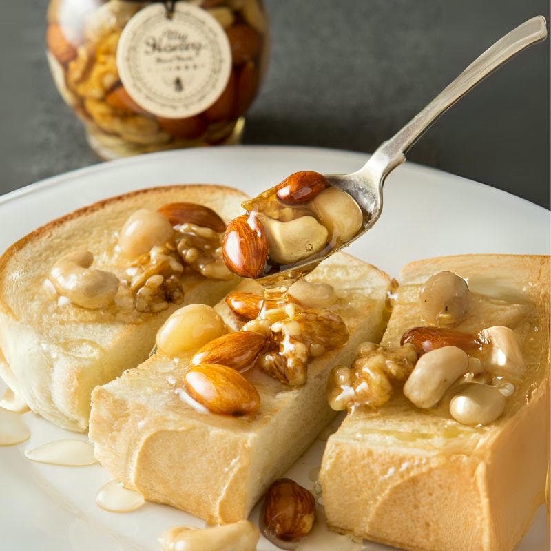 東京・表参道に本店を構える、はちみつ専門店MY HONEY のギフトセットです。ナッツの蜂蜜漬けには、非加熱のハンガリー産アカシアはちみつを使用しています。ナッツはアーモンド、カシューナッツ、くるみ、マカダミアナッツを使用しています。非加熱のはちみつには栄養素がたっぷりで、美容の面でも大変人気の商品です。アカシアはちみつは、クセのないスッキリとした味わいで、一度食べるとやみつきになる味わいです。