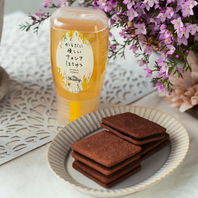 東京・表参道に本店を構える、はちみつ専門店MY HONEY のギフトセットです。クセの少なく食べやすいアカシアはちみつは非加熱・低GI。美容と健康に不可欠なビタミンや酵素がたっぷり入っています。使いやすいボトルタイプのはちみつ。お砂糖不使用の添加濃厚チョコレートサンドのセットです。