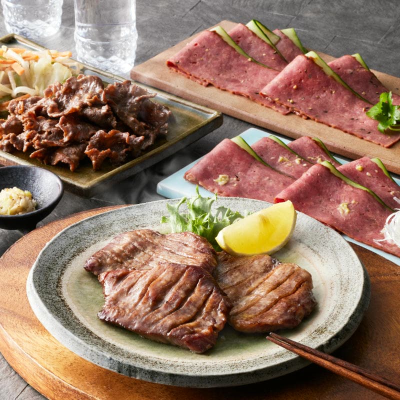 厚切り牛たんとペッパー・わさびのおつまみ、牛たんおかずをセットしたお酒のおつまみに最適なセットです。