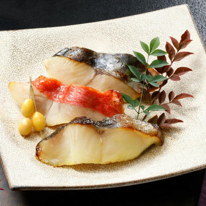 【原材料名】銀鱈西京漬、金目鯛西京漬、鰤西京漬、鰆西京漬、鮭西京漬(サーモントラウト)各70g×1