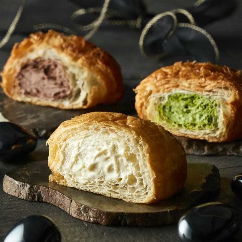 カスタード・抹茶・チョコの3種類が楽しめる、贈り物にもぴったりのクリームクロワッサンです。
