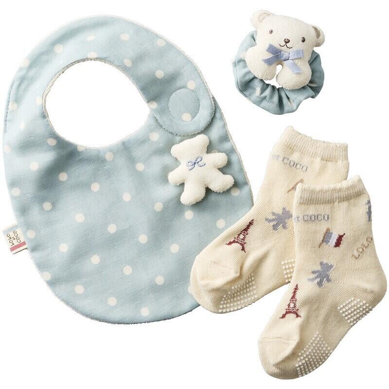 クマモチーフのスタイやリストガラガラ、足元を温かく守るソックスなど、赤ちゃんの肌に優しい素材で作られています。