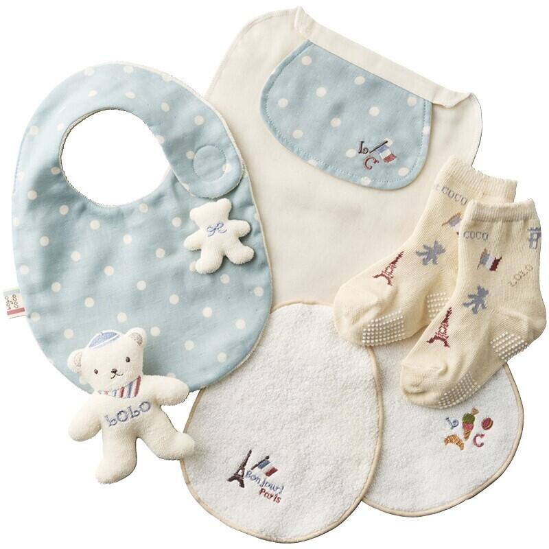 授乳スタイやクマモチーフのスタイ、ガラガラ、ソックスなど、赤ちゃんが気持ちよく過ごせるアイテムばかり。