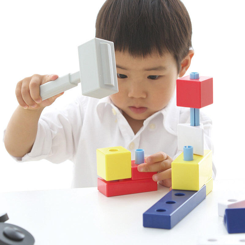 つみきやタイヤ、くぎパーツに加え、ハンマーとくぎぬきがセットになっており、遊びながら手先の器用さや集中力を育てます。