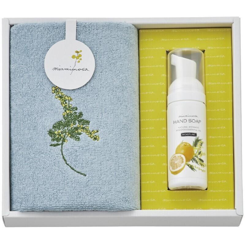 春を告げる花ミモザをモチーフとした今治タオルと、天然香料ミモザ精油とグレープフルーツの香りが爽やかな、アミノ酸系洗浄成分配合のクリーミィーな泡で手肌をやさしく洗い上げるハンドソープのセットです。