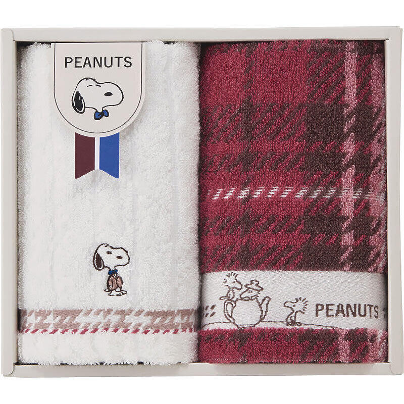PEANUTS どこか懐かしく、あたたかな雰囲気をもつタータンチェック。チェックファッションに身を包んだスヌーピーがゆったりとティータイムを楽しんでいるアートをさりげなくあしらいました。華やかでありながら、落ち着きがあり心地よさを感じていただけるタオルギフトです。