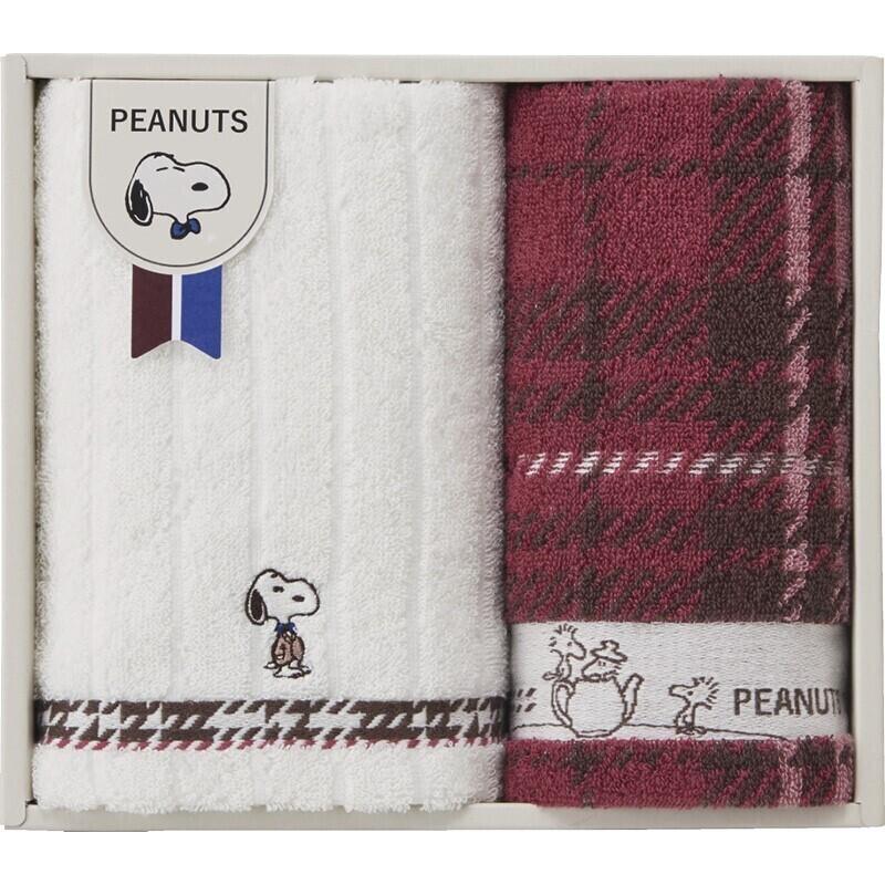 PEANUTS どこか懐かしく、あたたかな雰囲気をもつタータンチェック。チェックファッションに身を包んだスヌーピーがゆったりとティータイムを楽しんでいるアートをさりげなくあしらいました。華やかでありながら、落ち着きがあり心地よさを感じていただけるタオルギフトです。