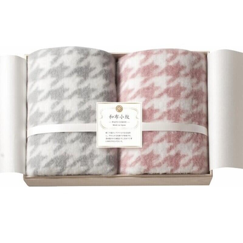 どなたでも使いやすい千鳥格子柄。軽くて暖かいアクリルの糸を使用しやわらかな肌触りが特徴です。木箱に入れてお届けします。