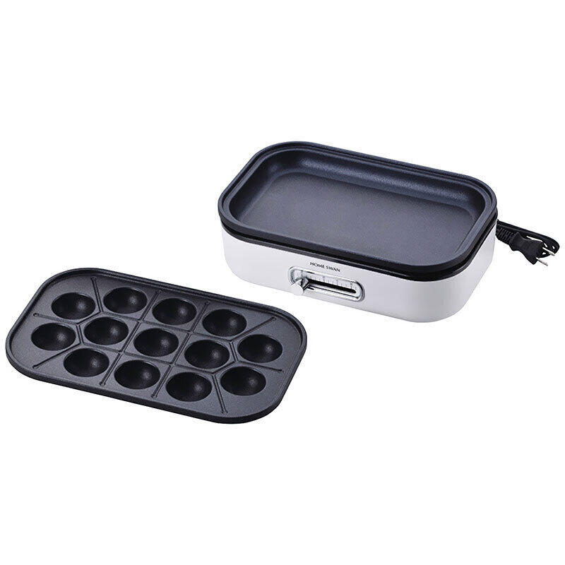 現品・内容・サイズ・材質: 27×19×8.5cm・本体:ポリプロピレン・平面プレート・たこ焼きプレート各1個・アルミダイキャスト(フッ素樹脂塗装)・消費電力:800W・コード長:約1.4m