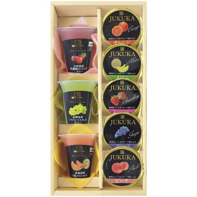 さくらんぼの王様とも評される山形県産の佐藤錦果汁を使用した佐藤錦のゼリーや、マスカットの芳香を持つ長野県産シャインマスカットの果汁を使用したマスカットゼリー、北海道を代表する高品質の果実「夕張メロン」の果汁を使用したマスカットゼリーなどの詰合せです。