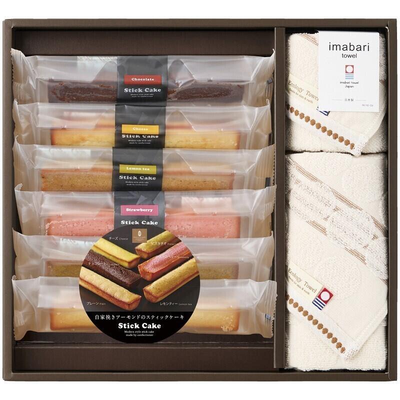 【セット内容】フェイスタオル(34×80cm)・ウォッシュタオル(34×35cm)・スティックケーキ(プレーン・チョコ・チーズ・レモンティー・ストロベリー・ピスタチオ)×各1